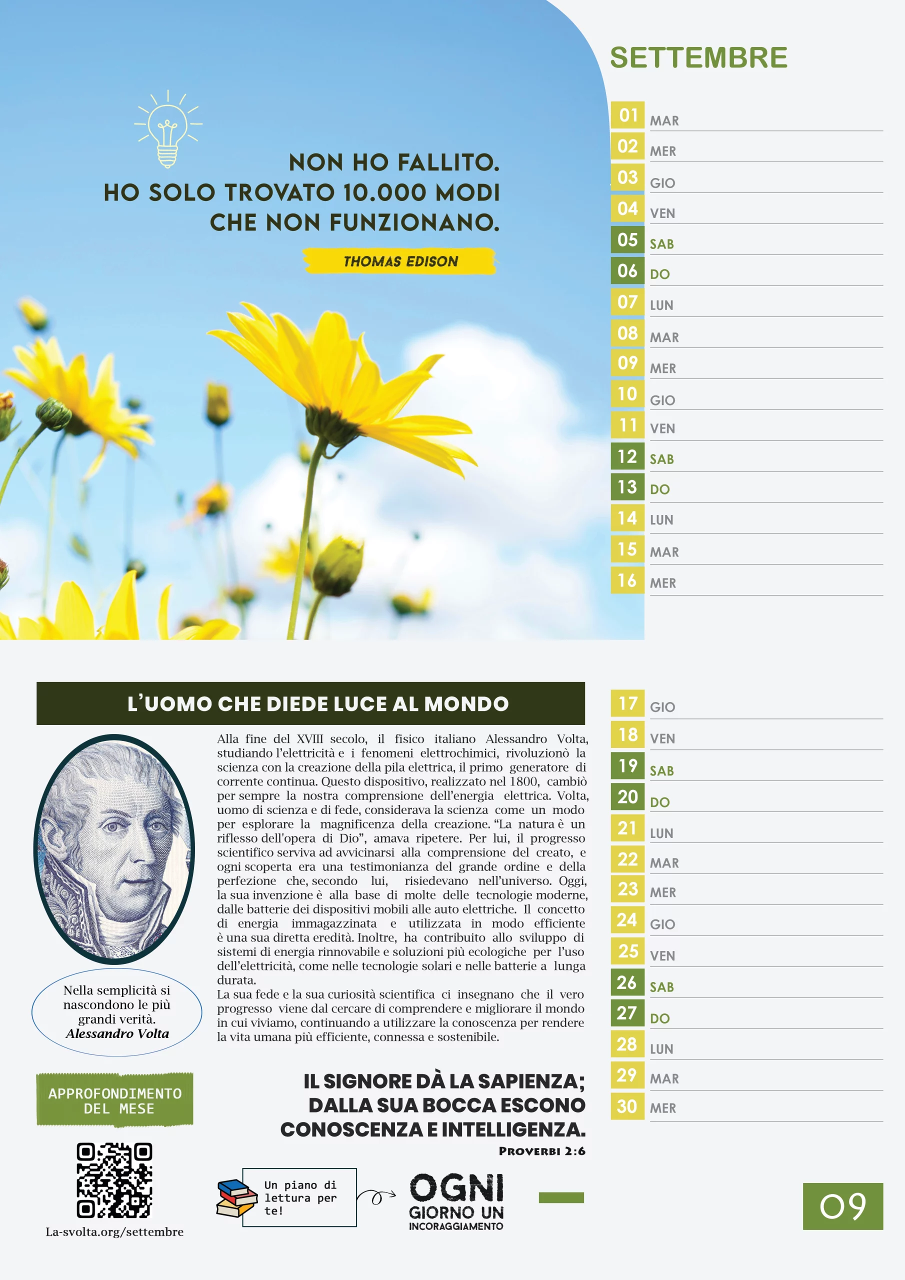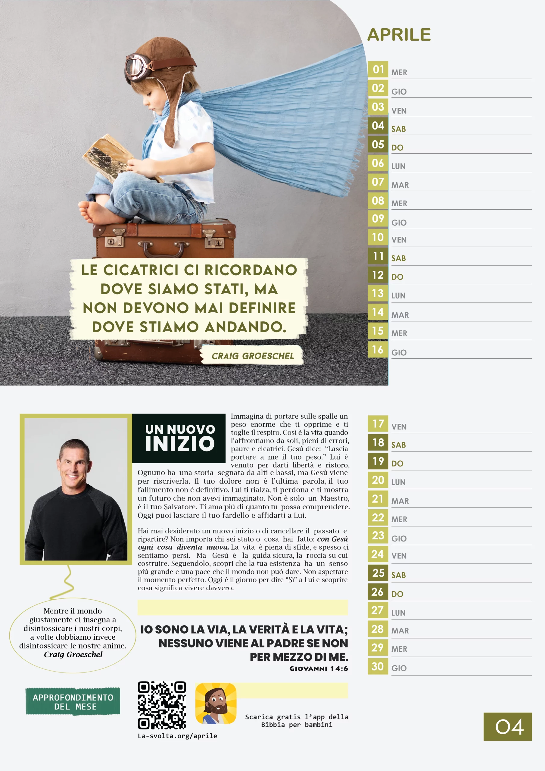 Il calendario contiene, storie incoraggianti, citazioni, versetti. Inoltre tramite un codice QR/link, diverso per ogni mese, sarĂ possibile visionare un approfondimento, piccole riflessioni, e in alcuni mesi la possibilitĂ di ascoltare/vedere musica cristiana, il film di GesĂą, cortometraggi interessanti e che faranno riflettere.